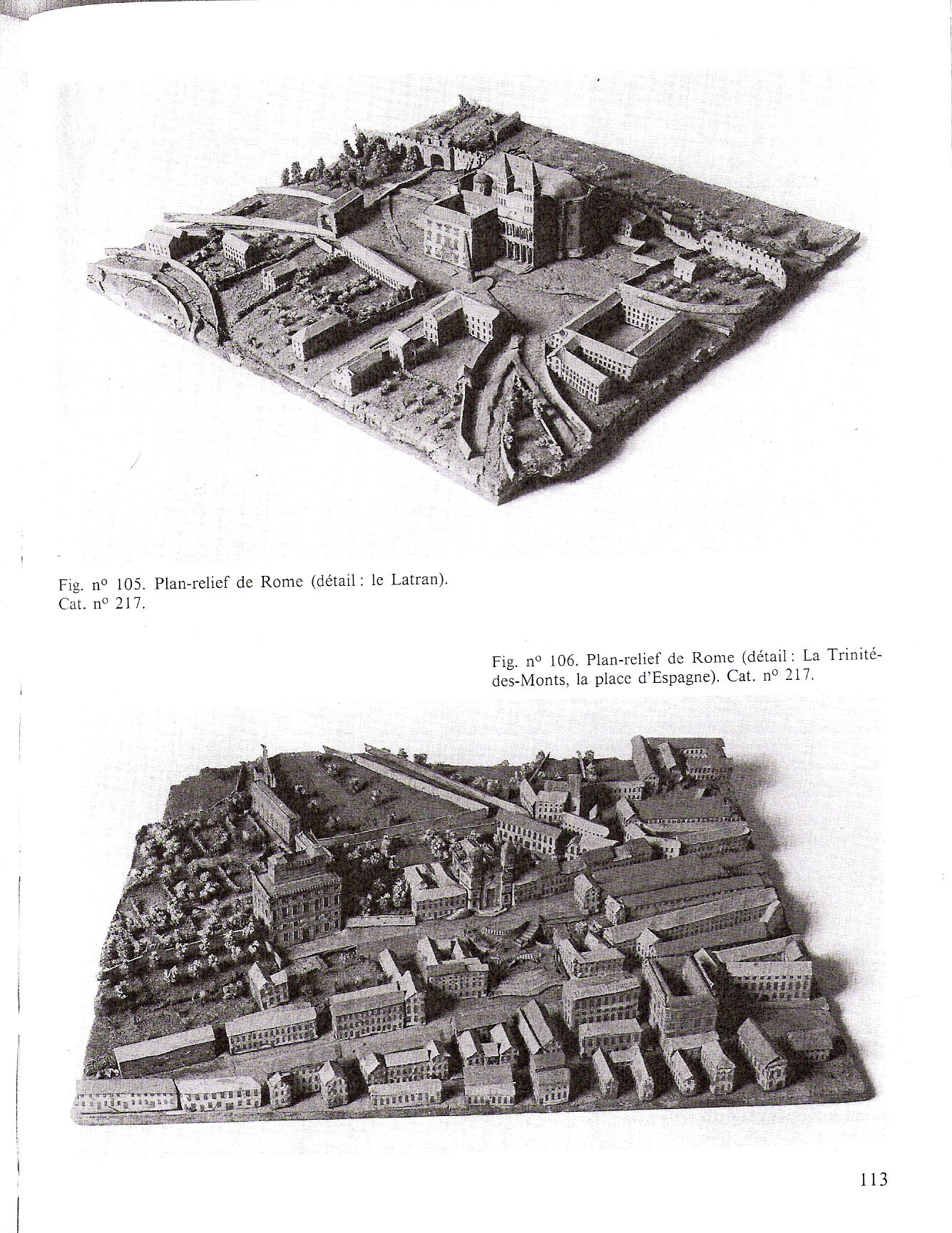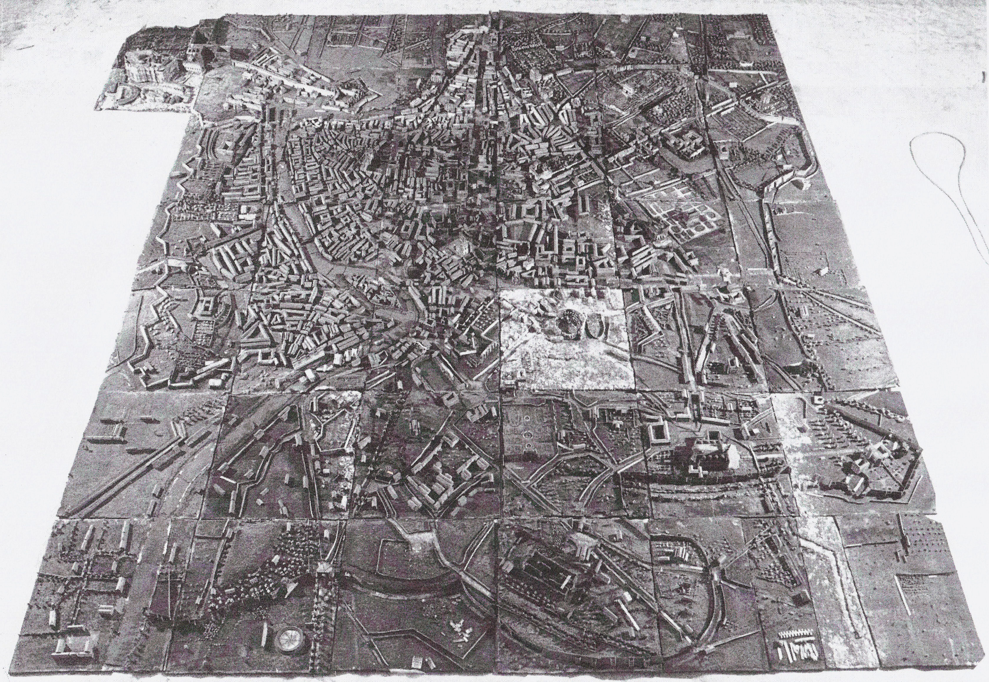 Consisting of 44 sections each about 50cm square which fit together, it forms a rectangle of 6 sections by 7, complemented in one corner by two sections which house the Vatican. The model is of the city within its walls, and of its immediate surroundings. Each piece of wood is covered with cork to suggest higher ground where appropriate and squashed fairly flat in other places, and dyed silk finely cut, mixed with sand and made wet so it could be rolled out to form meadows and ploughed fields. The Tiber is made of coloured silver paper; trees and shrubs are silk twisted round wire; in the streets and squares ornamental tiles are reproduced with painted paper; the noble buildings (St John Lateran, great palaces, the Pantheon, etc.) are made of cardboard or cork sometimes with pieces of soft wood added (columns, pilasters, etc.). For the ordinary houses and blocks of flats the artist made do with blocks of wood covered with pasted paper on which the architectural details are painted or drawn with a pen, or where necessary punched out of cardboard and stuck on. Pictures from A forgotten collection: the ancient models of the Museum of National Antiquities by Jannic Durand |